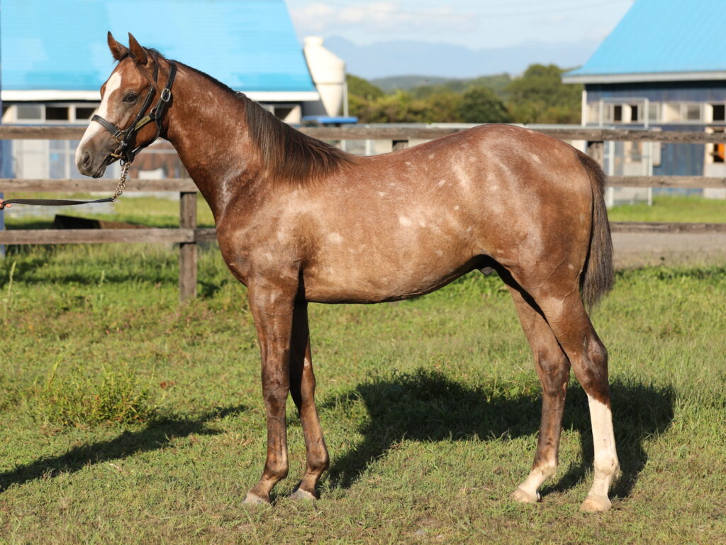 こちら、共有馬主募集中のエイシンサンタフェの2024。東海三冠など重賞8勝で地方競馬のみで1億円超を稼いでいるフークピグマリオンの半弟にあたります。兄弟は本馬の他にもJRA3勝を挙げ現在は金沢で走っている獲得賞金4401万円のカサデガや、川崎ジュニアOPなど南関東6勝を挙げ羽田盃にも駒を進めたファルコンソードなど活躍馬多数。5月生まれのため平均より少しだけ小さめですが、腰高なシルエットを見ると恐らく追いついて来るでしょう。JBC2歳優駿(JpnIII)を勝ち、打倒中央を果たした北海道三冠馬ソルジャーフィルドを輩出した北海道・川島洋人厩舎からデビュー予定。利発そうな小顔の馬で歩様を見ても兄弟に負けないオーラがあり、大舞台での活躍が期待出来そうな一頭です。
