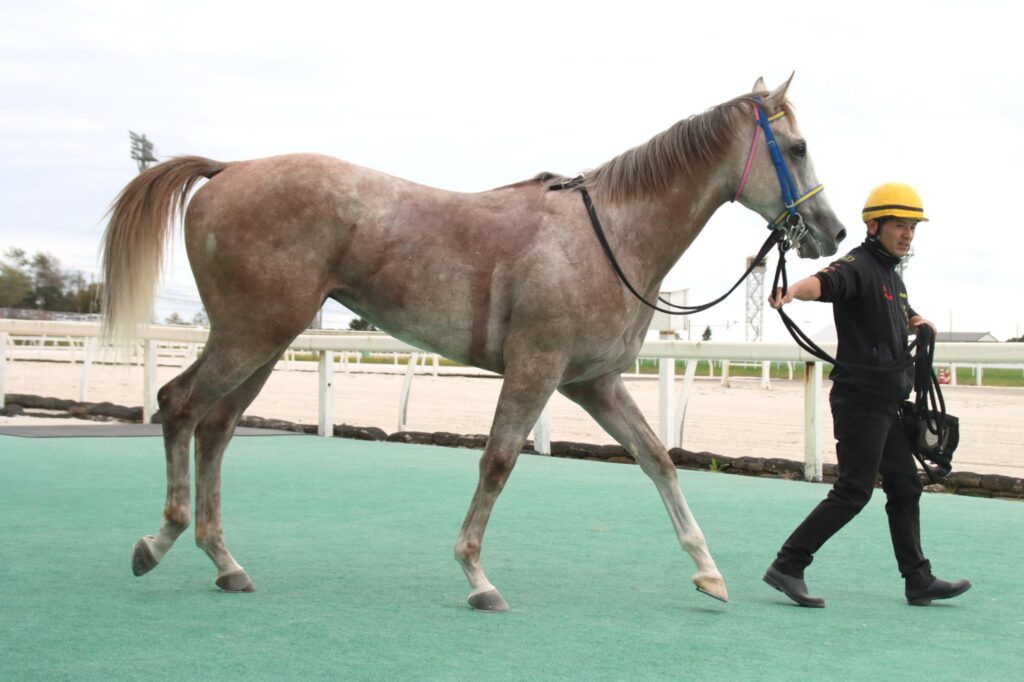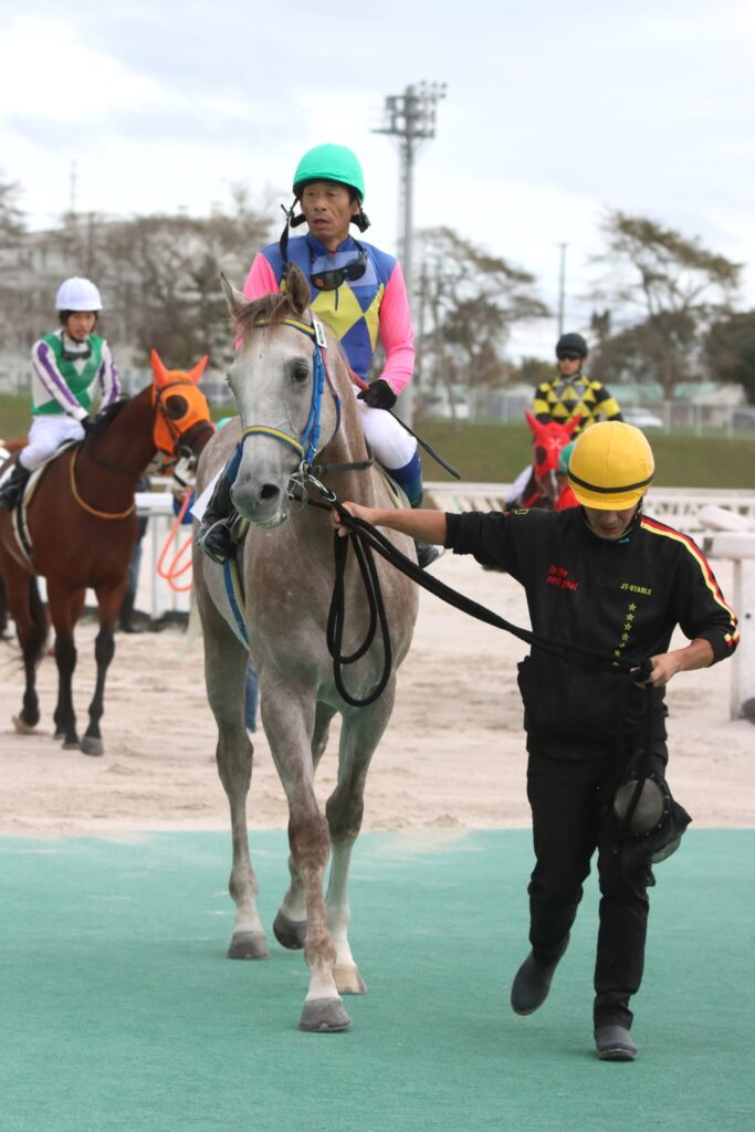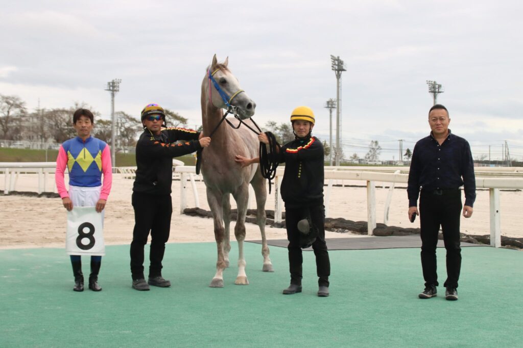「ありがとうございました。勝つには勝ちましたけど、勝負処でもハミを取らずあっち向いたりこっち向いたりふらふらと遊んでいて、正直、直線半ばでは駄目かと思いましたよ(笑) 何とか1つ勝たせられて良かったです。最初の頃ブリンカーを試して駄目でしたが、今の感じだと効くかもしれないので、移籍先で試してみるのも良いかもしれませんね。」(田中淳司師)