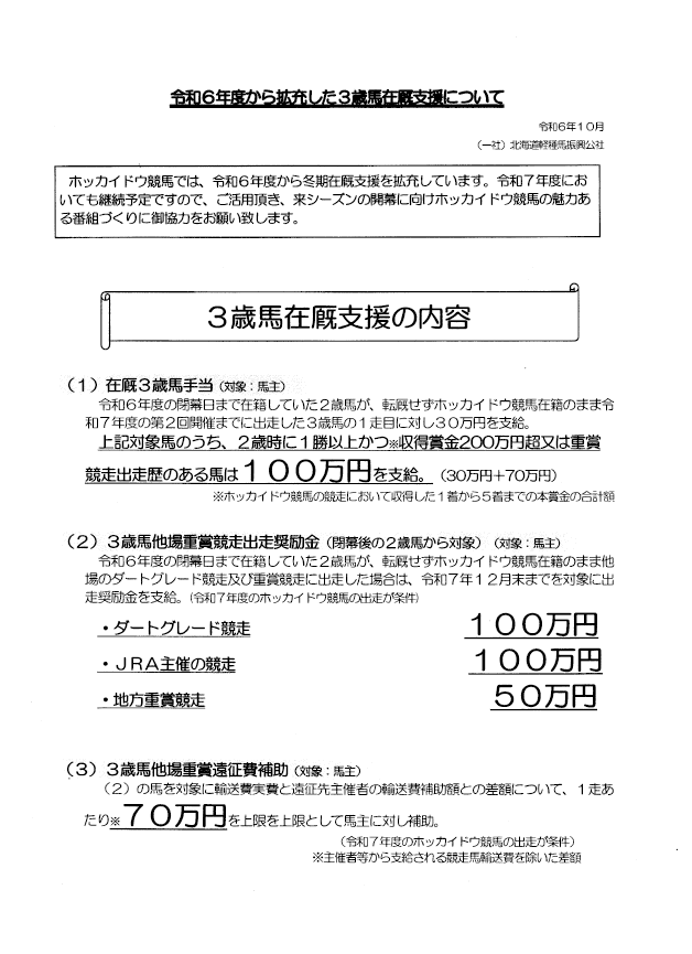 なお、今後は以下の3歳馬在厩支援が令和8年度も継続されるようであればオフシーズンも門別に在厩し、100万円の在厩3歳馬手当の受給を目指す予定です。また、喉の手術後に体調が整えば以下の奨励金を活用して年明け以降の中山または東京の1勝クラスのダート戦を使いに行く事も検討します。