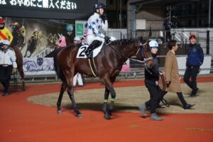 12/16(火)の水沢競馬11Rは2着(5人気)でした。「いや~惜しかったですね。マサ(鞍上)も追い出しを待って追撃を振り切って勝ったと思ったが、まさか外からあの勢いで来られるとは思っていなかったと話していました。でも逃げて自分のペースに持ち込めると好走してくれますね。あと少し距離が短ければと思いますが、1600mだからこそ競って来る馬がいないのかもしれませんし、1400mとどっちを使うか迷いどころですね。ひとまず上がりの歩様は問題ないですが、膝裏の状態を見極めながら年内後1回使っていくかどうか考えていきたいと思います」(陶師)