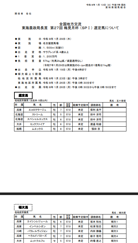 昨日遅くに1/29名古屋・梅見月杯(SPI)の選定馬が発表され、本馬は補欠5番手でした。この順位ですと繰り上がりが微妙で騎手を頼みずらいため、ここは回避して1/26の大井ジュエリーアイス賞A2B1・1600m戦に向かう予定です。