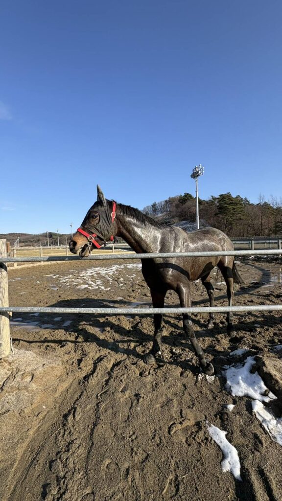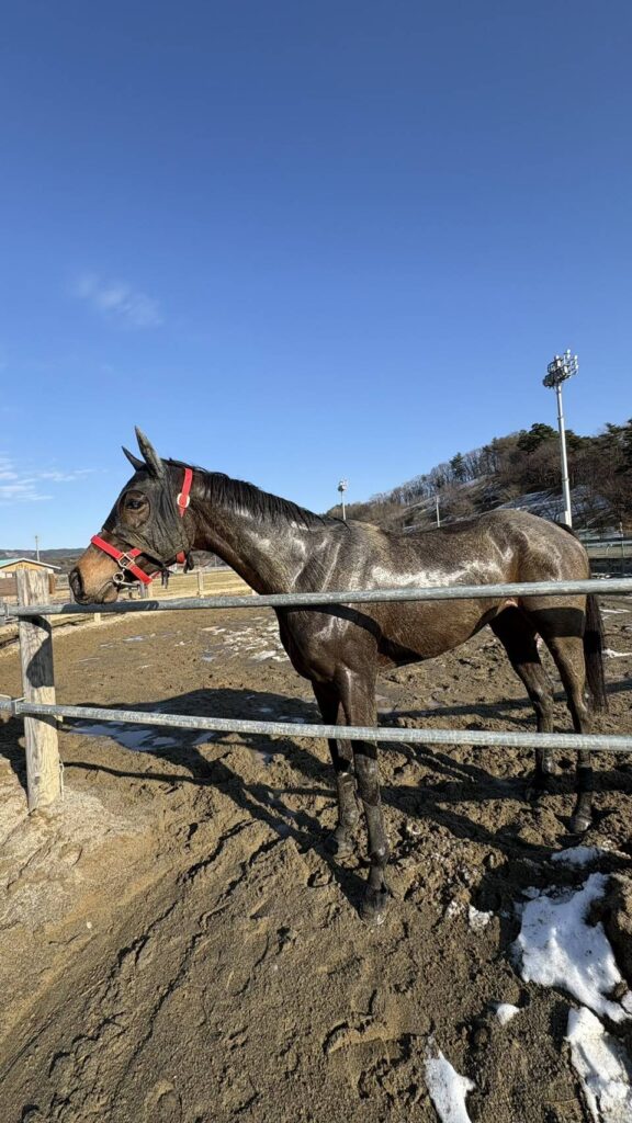 1/18(日)現在、盛岡競馬場・陶厩舎在厩。「前走後も特に変わりなく元気に過ごしています。エサも残さず完食していますよ。岩手は元日からはコースが使えず厩舎周りにも積雪や凍結などがありますので、基本的には舎飼いで休養になります。やはり水沢より盛岡の方が雪が多い印象ですね。昨年は良く頑張ってくれましたから、これが良い休養になってくれればと思います。2月9日に馬場開きがありますので、1/26あたりから厩舎周りでの運動から始めていく予定です。今週あたりから天気の良い日があればパドック放牧に出してみます」(陶師)
