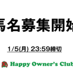 2025年12月25日 / 最終更新日時 : 2025年12月25日 happy-owners お知らせ 【お知らせ】2024年産募集馬 馬名募集のお知らせ 本日より、2024年産募集馬13頭(エイシンサンタフェの2024,エコパンの2024,キタサンスズランの2024,ダイヤインザラフの2024,デリケートアーチ2024,トウカイポプリの2024,ビーチキャンドルの2024 […]
